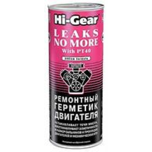 Ремонтный герметик двигателя Hi-Gear LEAKS NO MORE with PT40. Гарантированно устраняет течи (примерно через 500 км пробега) через прокладки и сальники системы смазки двигателя. Может использоваться для устранения течей через сальники и прокладки механических КПП. Совместим со всеми типами моторных и трансмиссионных масел. Позволяет избежать дорогостоящих ремонтов.